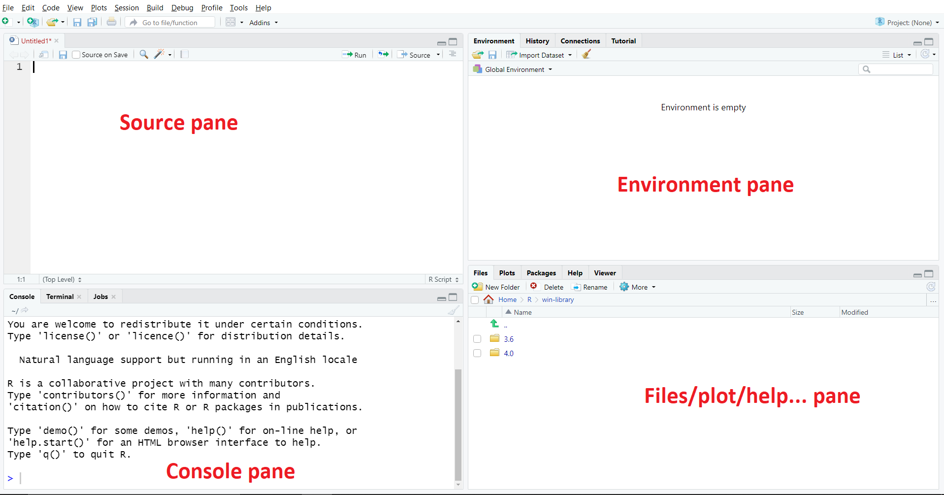 The R Studio editor consists of R main panes - the “Source”, “Console”, “Environment/History/…”, and “Files/Plots/Packages/…”. You can adjust their location and hide them under the pane button, located on the right side of the navigation bar.