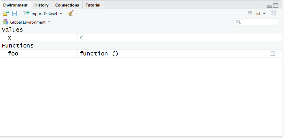 Again, function foo will appear in your environment with an appropriate label. You will learn more about assignment and functions in R Programming Basics and Key Programming Concepts. Here, the most important takeout point is that the “Environment” tab allows you to see all the objects you have defined in R, along with some of their key properties.
