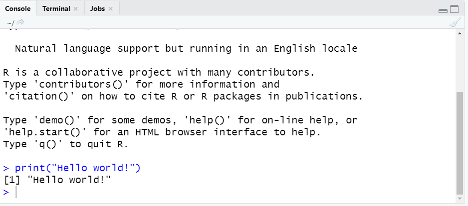 print("Hello world!")You can also try entering simple mathematical calculations such as 2+2 and see that R works perfectly as a calculator. Note that you should rarely enter longer pieces of code into the console. To ensure reproducibility of your work, the code should always be executed from saved R Scripts.