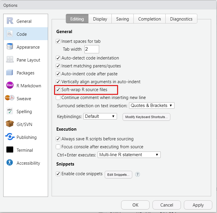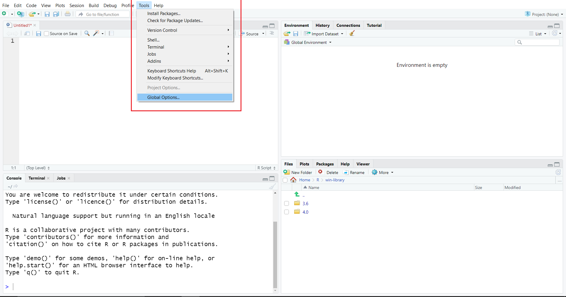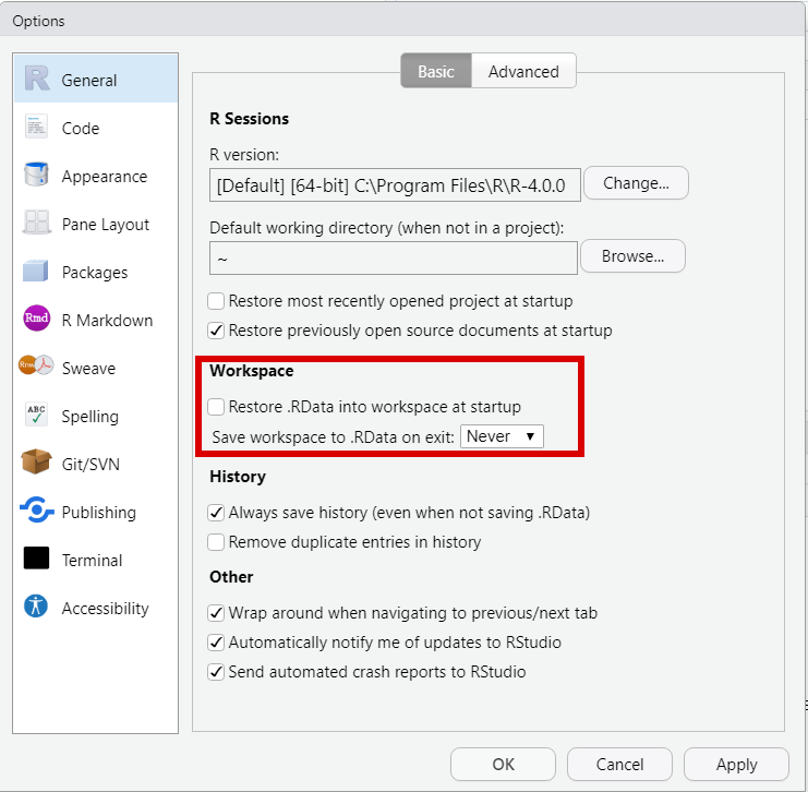 Now that you are done with the installation, you are ready to start using R - you can do that by clicking the RStudio shortcut. After opening the application, there are a couple of things that are useful to set up. First, open the “Tools” tab at the top of the window and select “Global Options”. There, under the “General tab” uncheck “restore .RData into workspace at startup” and set “Save workspace to .RData on exit” to “Never”. This is to ensure your R session always starts clean, without the objects loaded from the previous time you have used it. Then, in the “Code” section, check the option “Soft-wrap R Source file”. Finally in the “Appearance” section select editor theme of choice, as well as the appropriate font size and zoom. Click Apply and then OK once all this is done.