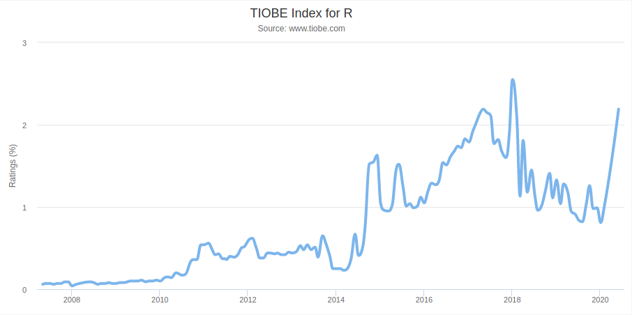 3. It is widely applied - in 2019, R was the 5th most popular tool for data science mentioned by job advertisements on indeed.com. It is widely used in a variety of industries, including tech, consulting, think-tanks and public institutions.