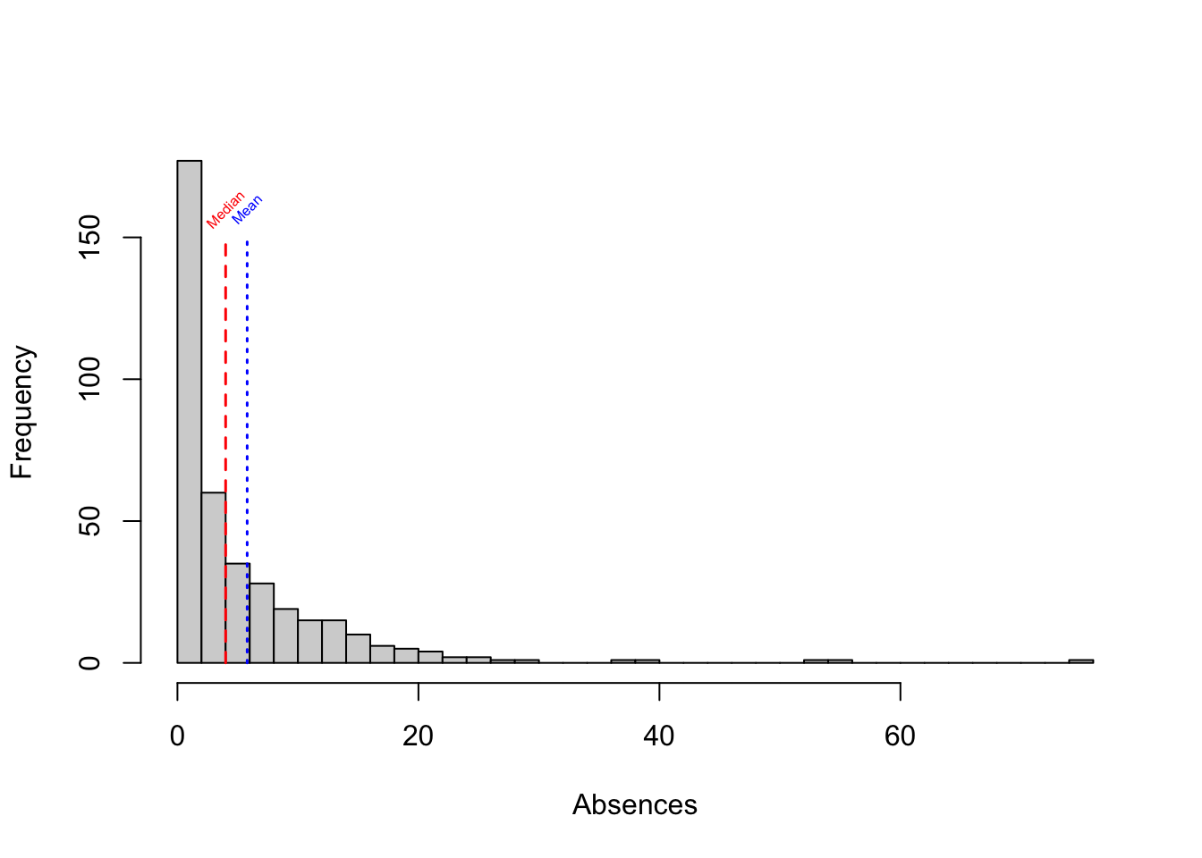 The median is a specific quantile - the 50th percentile of a variable, i.e. the midpoint of the variable’s distribution. As opposed to the mean, it’s not affected by outlying values. Large differences between mean and meadian are often evidence of a skew in the variable’s distribution.