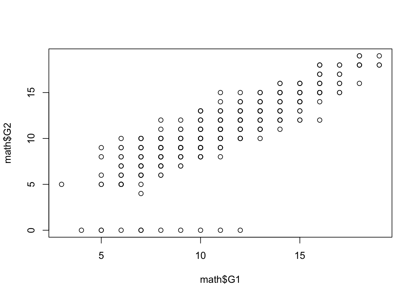 plot(math$G1, math$G2, xlab = "Grade in term 1", ylab = "Grade in term 2")