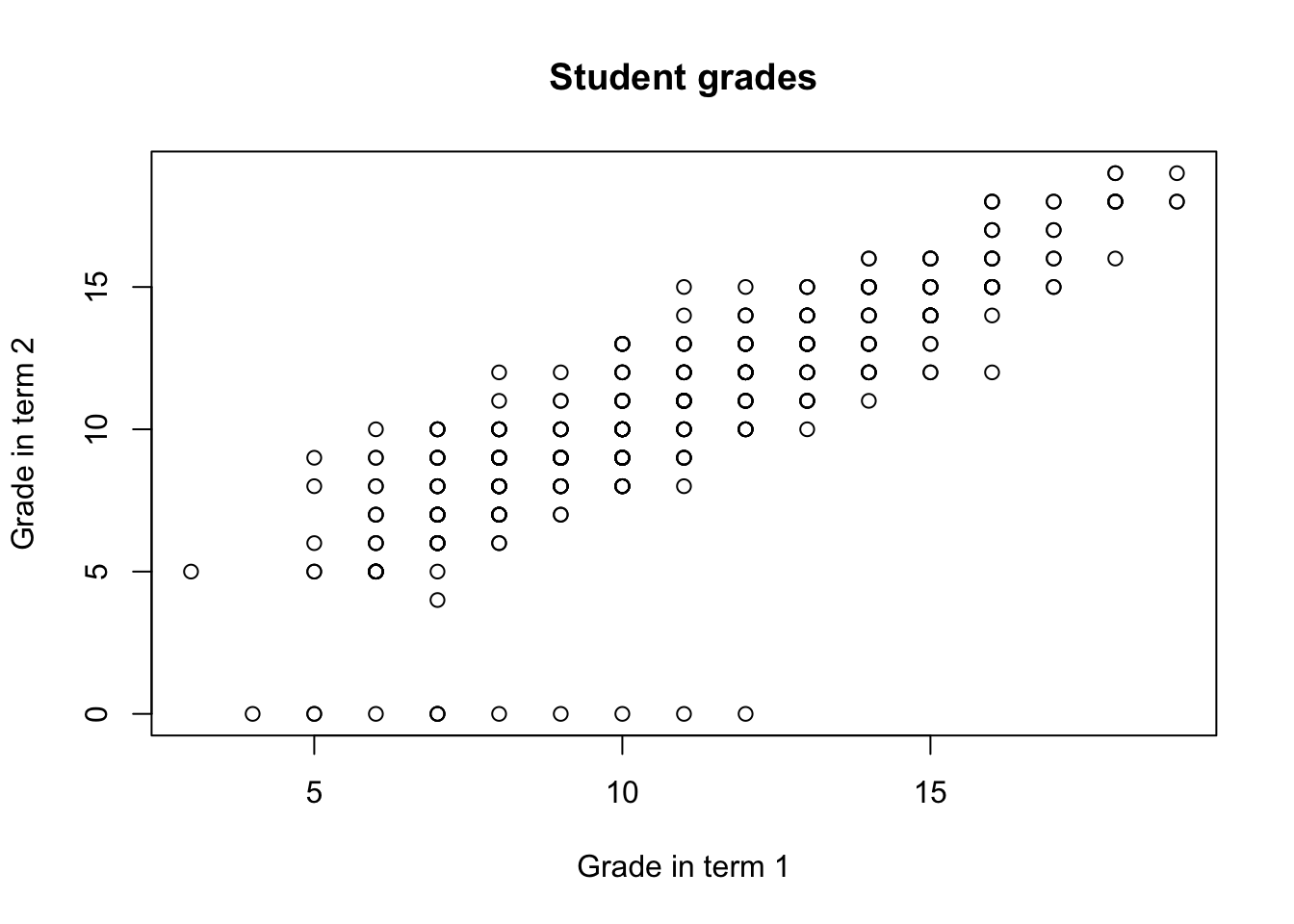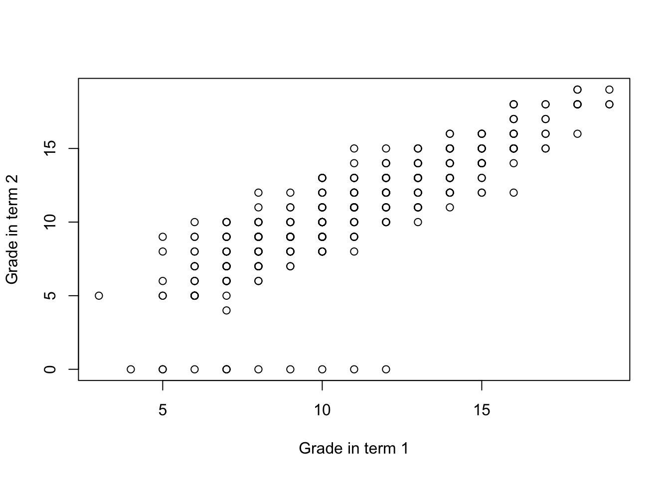 xlab = "Grade in term 1", ylab = "Grade in term 2",