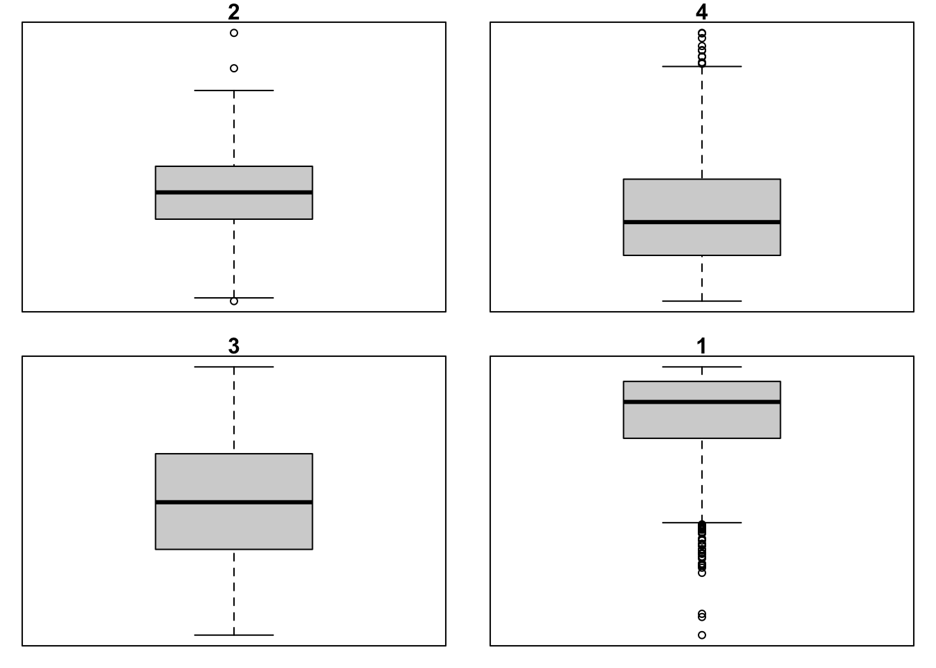 quantilefunction.Box plots summarize the distribution of a variable by presenting the interquartile range as a box, with median as a tick line in the middle, whiskers extending to the maximum and minimum and dots marking outliers.