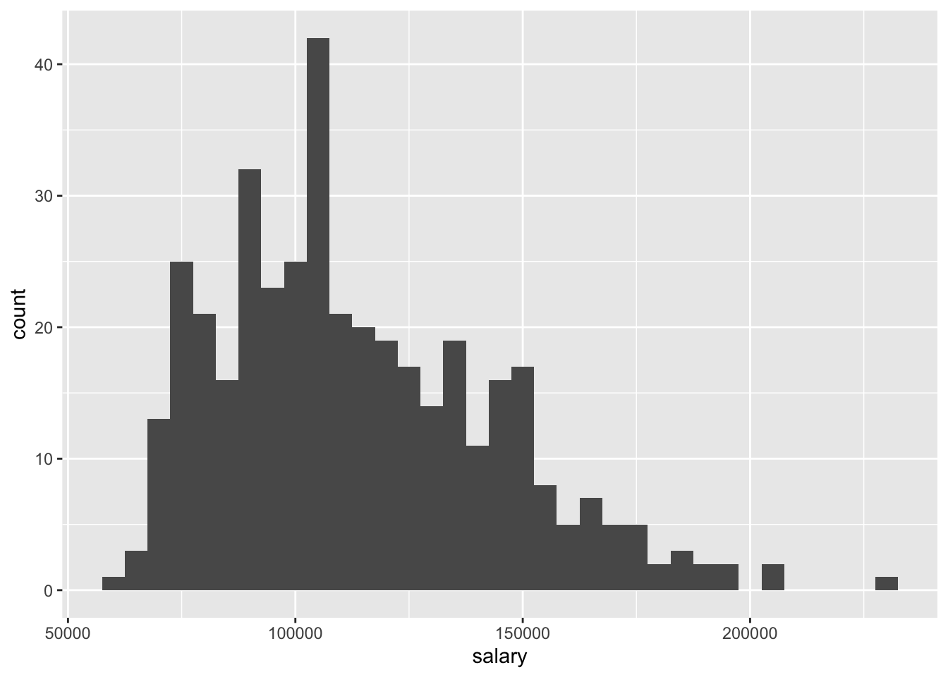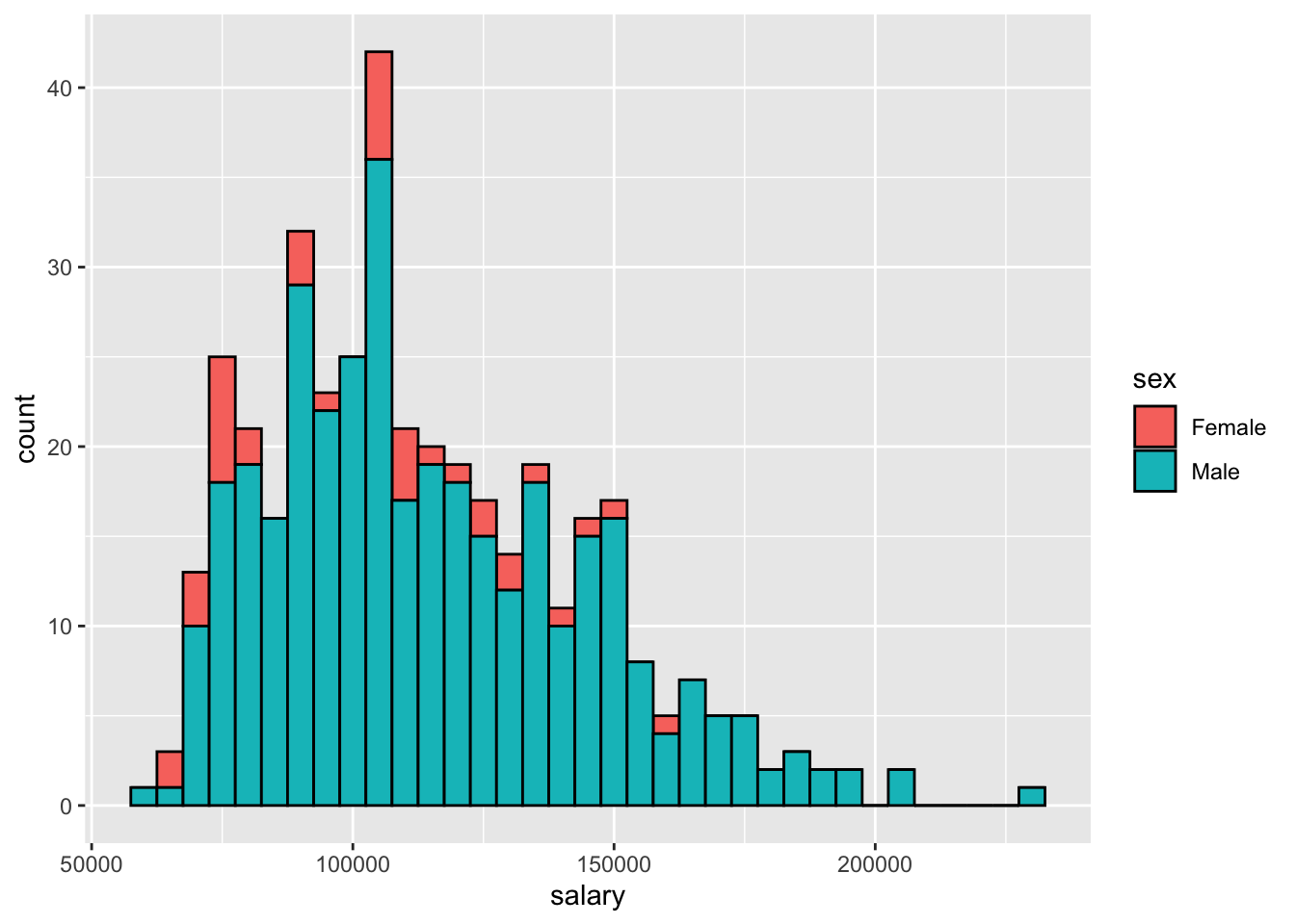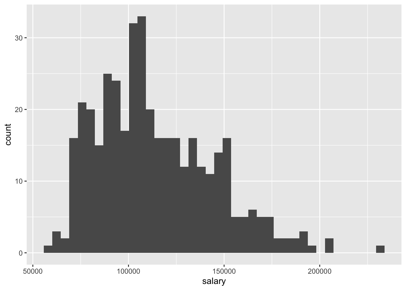 An important thing to note is that the aesthetic mapping created by the aes() function can be defined globally i.e. for the entire ggplot figure, as in the case above (ggplot(Salaries, aes(x = salary))), as well as a locally, i.e. only for one specific geom (geom_histogram(aes(x = salary)). In the former case, the entire figure will use the set aesthetic mapping, while in the latter, it will apply only to the specific geom.