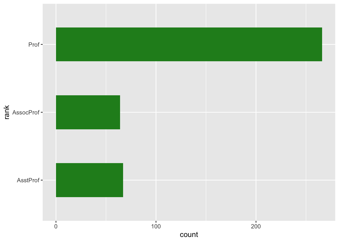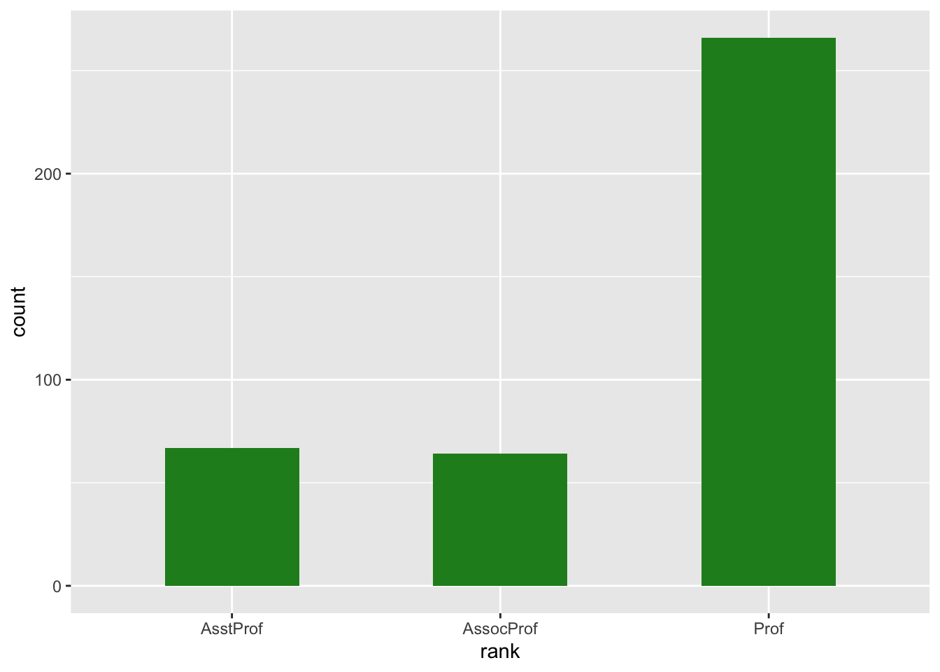 Histograms and kernel density estimates are useful in representing continuous variables, such as temperature, GDP or hours of absence. In case of discrete variables, which only take a finite and unordered set of values, it’s often better to use bar plots. With ggplot2, these can be easily obtained using geom_bar. For example, we can use it to represent the of academic ranks within our dataset.