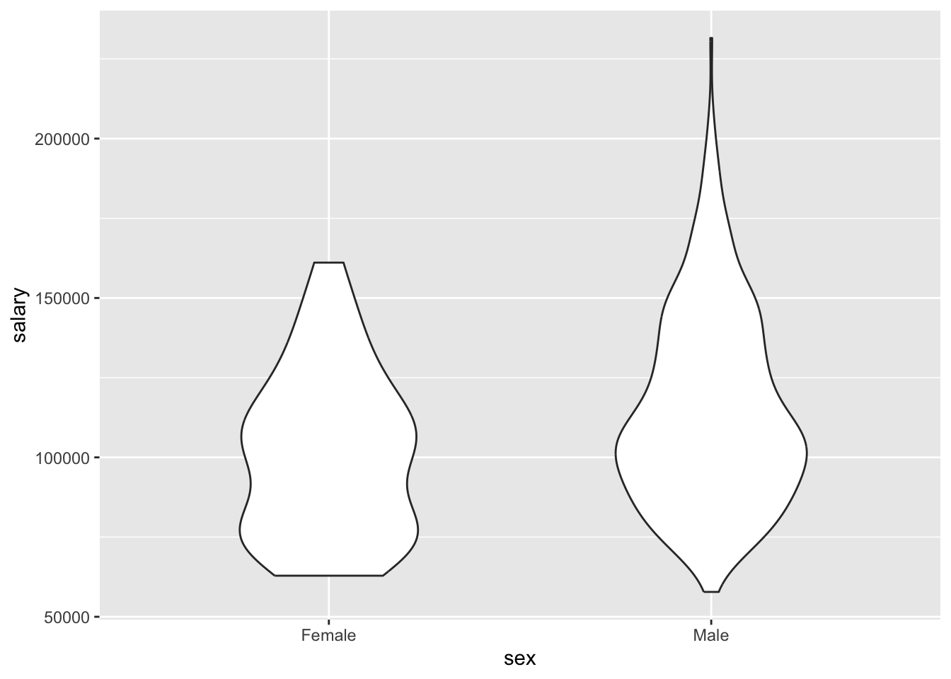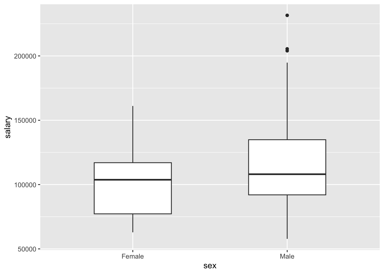 We can see that while the medians of Male and Female professor’s wages in our sample are similar, the interquantile range is much higher for men. At the same time, the distribution of male wages is more spread out, as indicated by larger box, longer tails. It also includes some outliers.