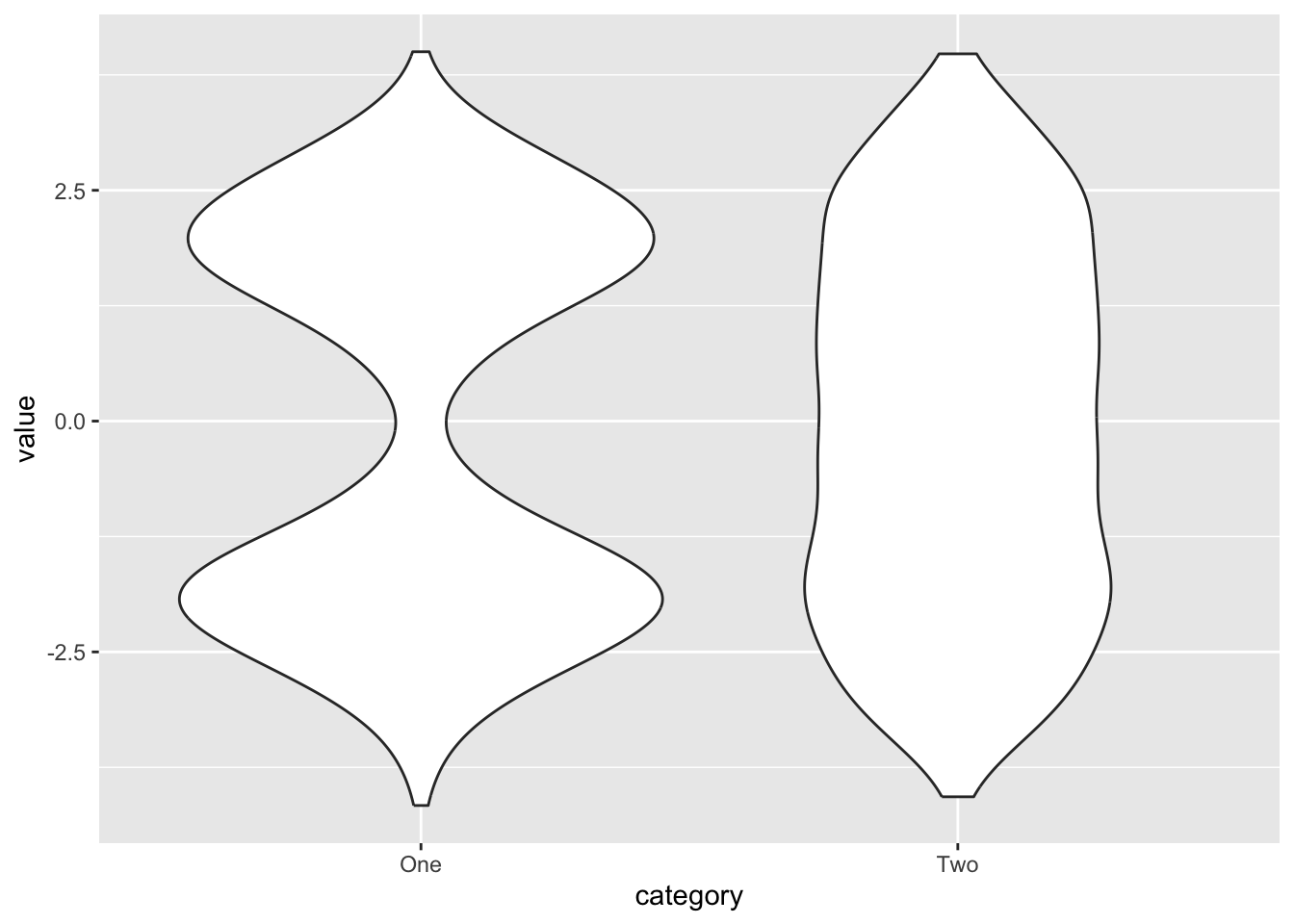However, the violin plot give away the entire story - namely the fact that the first category has two peaks (i.e. comes from a bimodal distribution, using the proper statistical terms), and it is unlikely that we observe the median value. A good example of such distributions from the political realm are the self-identification on the left-right ideological scale, with majority of respondents reporting to be either slightly conservative or slightly liberal.