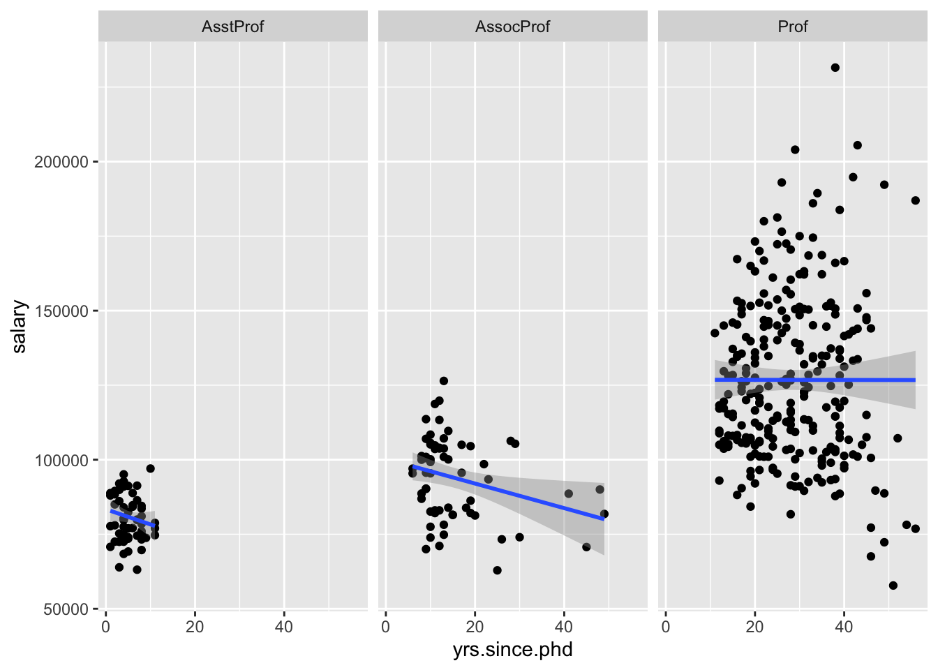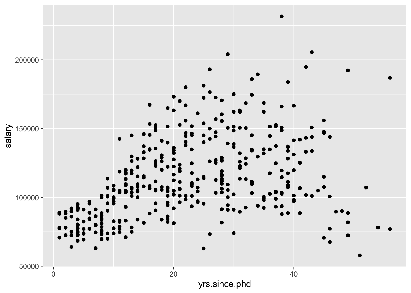 plt_sct <- plt + geom_point(aes(x = yrs.since.phd, y = salary)) +