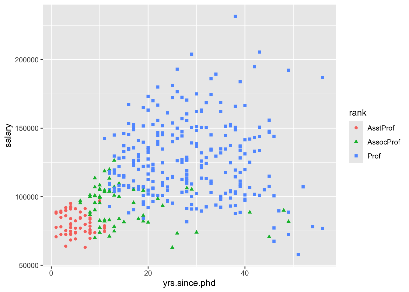 It is clear that we can see a some sort of relationship between the experience and earnings. In other words, there’s a degree of positive correlation between these two variables (we will examine this term more in depth in in the next chapter), i.e. professors with more experience tend to earn more on average. However, with experience the relationship becomes more noisy, as there’s more variation in earnings of the more experienced academics. As in the previous cases, we can specify additional aesthetics such as color or shape: