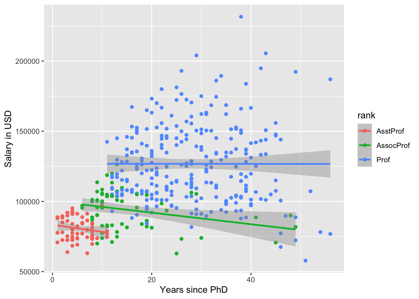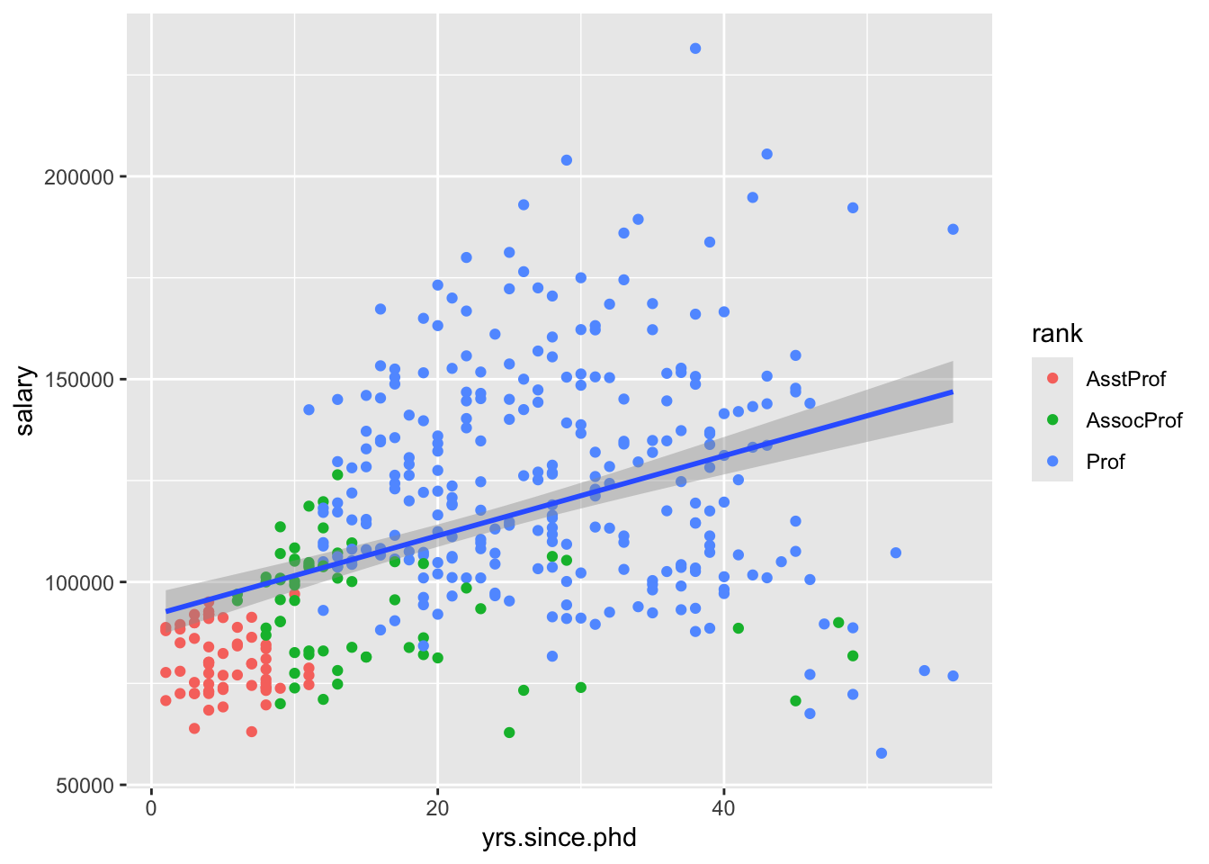 geom_smooth(aes(x = yrs.since.phd, y = salary), method = 'lm')