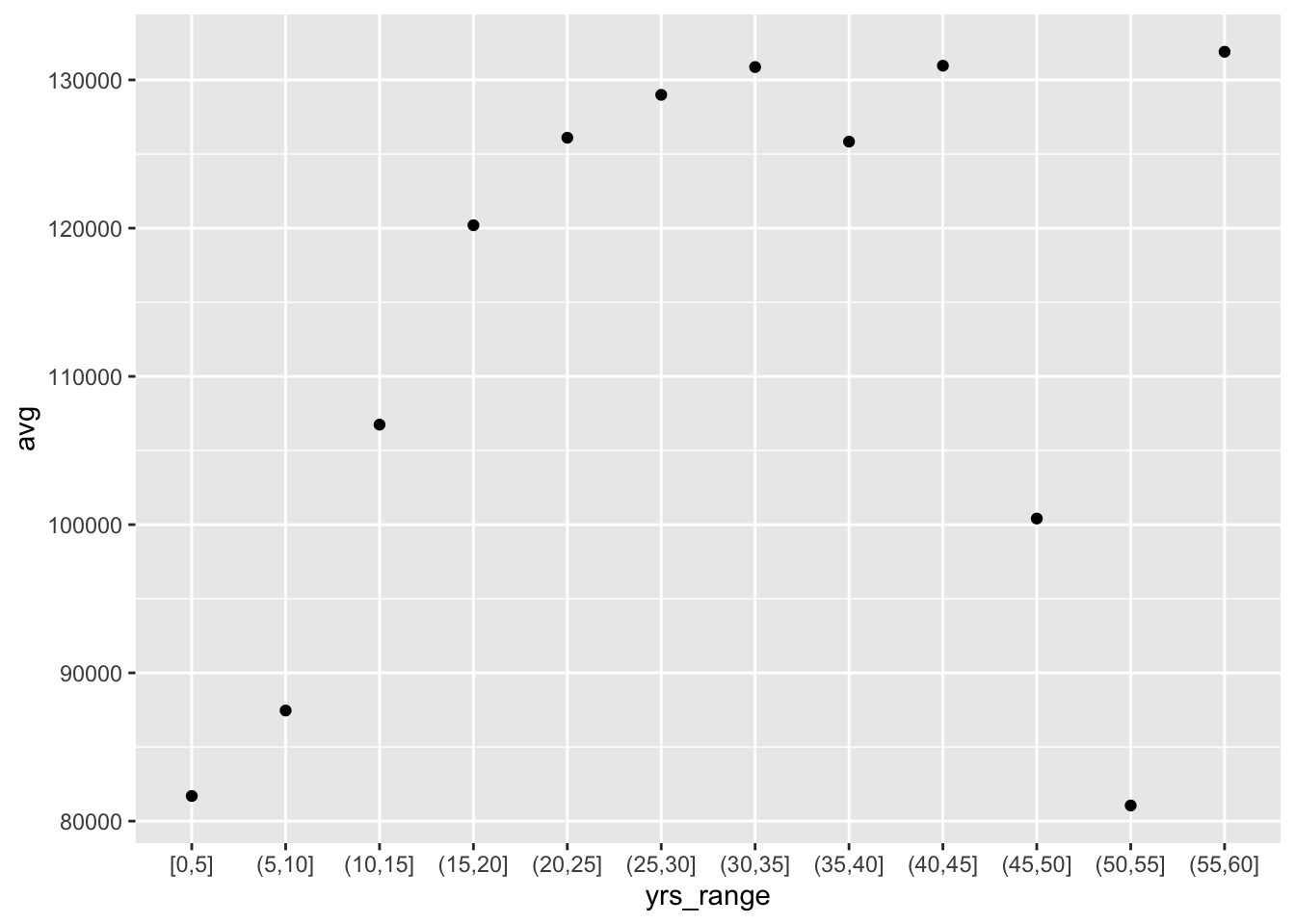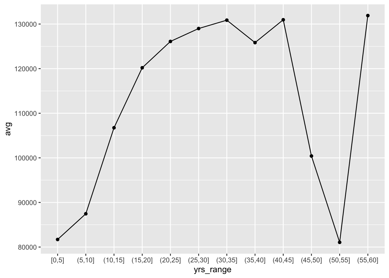 ggplot(byage, aes(x = yrs_range, y = avg, group = 1)) +