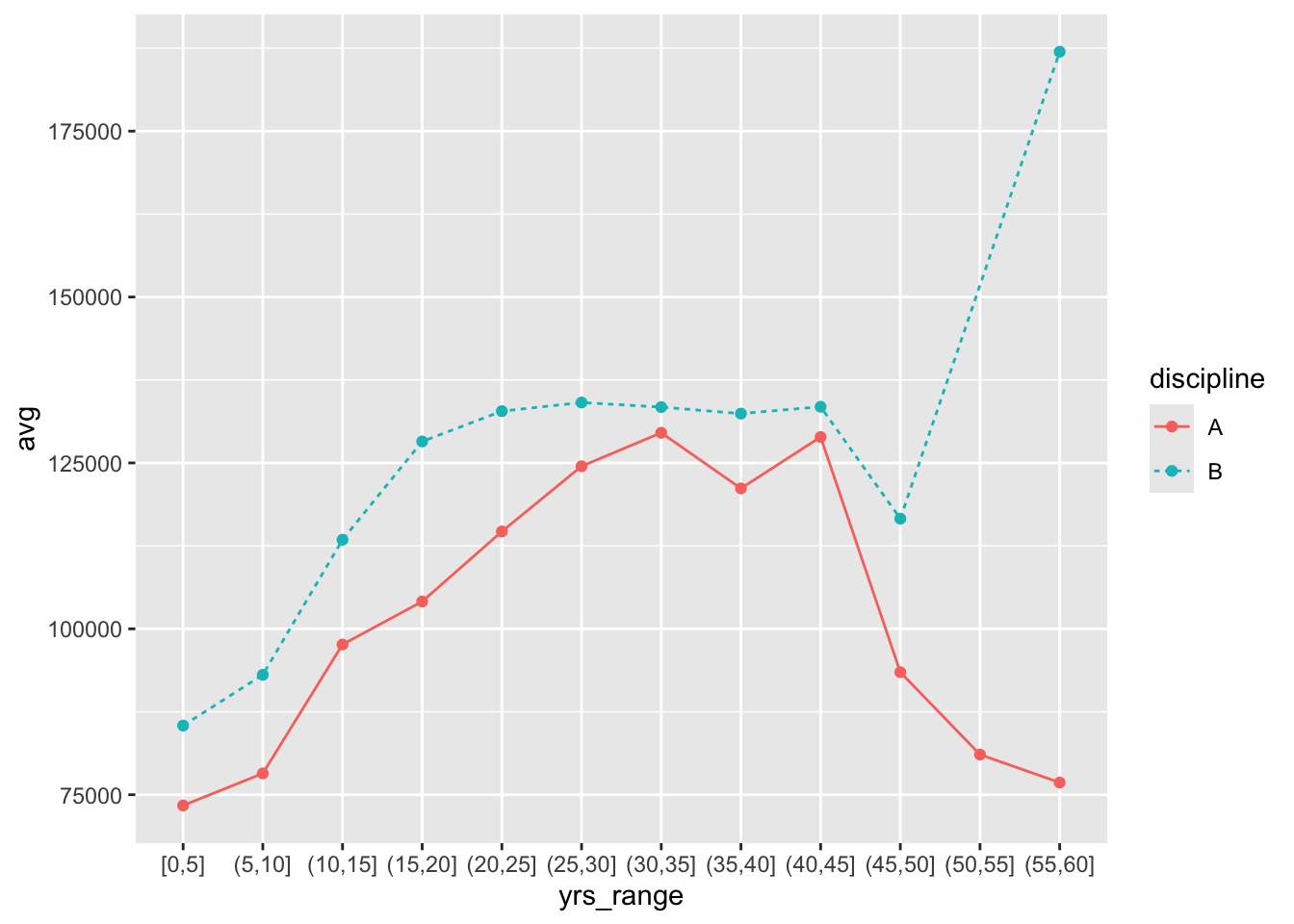 plt <- ggplot(byage, aes(x = yrs_range, y = avg, color = discipline,
