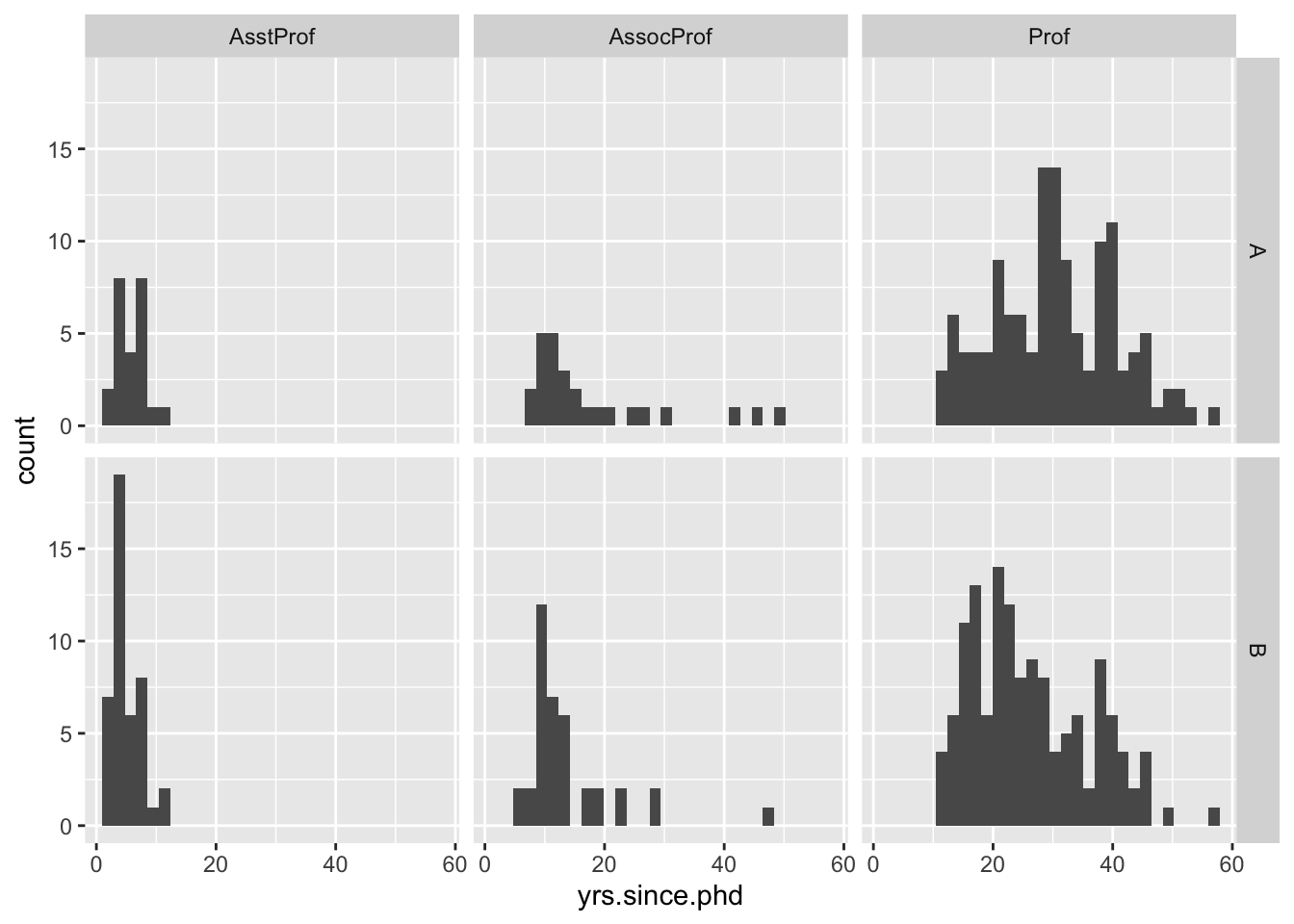 We can also facet using more than one variable and arrange the figures into a grid via a two dimensional grouping. For example, suppose we want to evaluate the distribution of the experience wihtin each combination of rank and discipline of the individuals. This can be achieved by using the facet_grid layer.