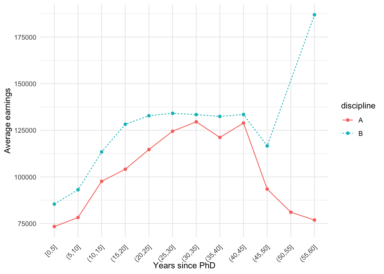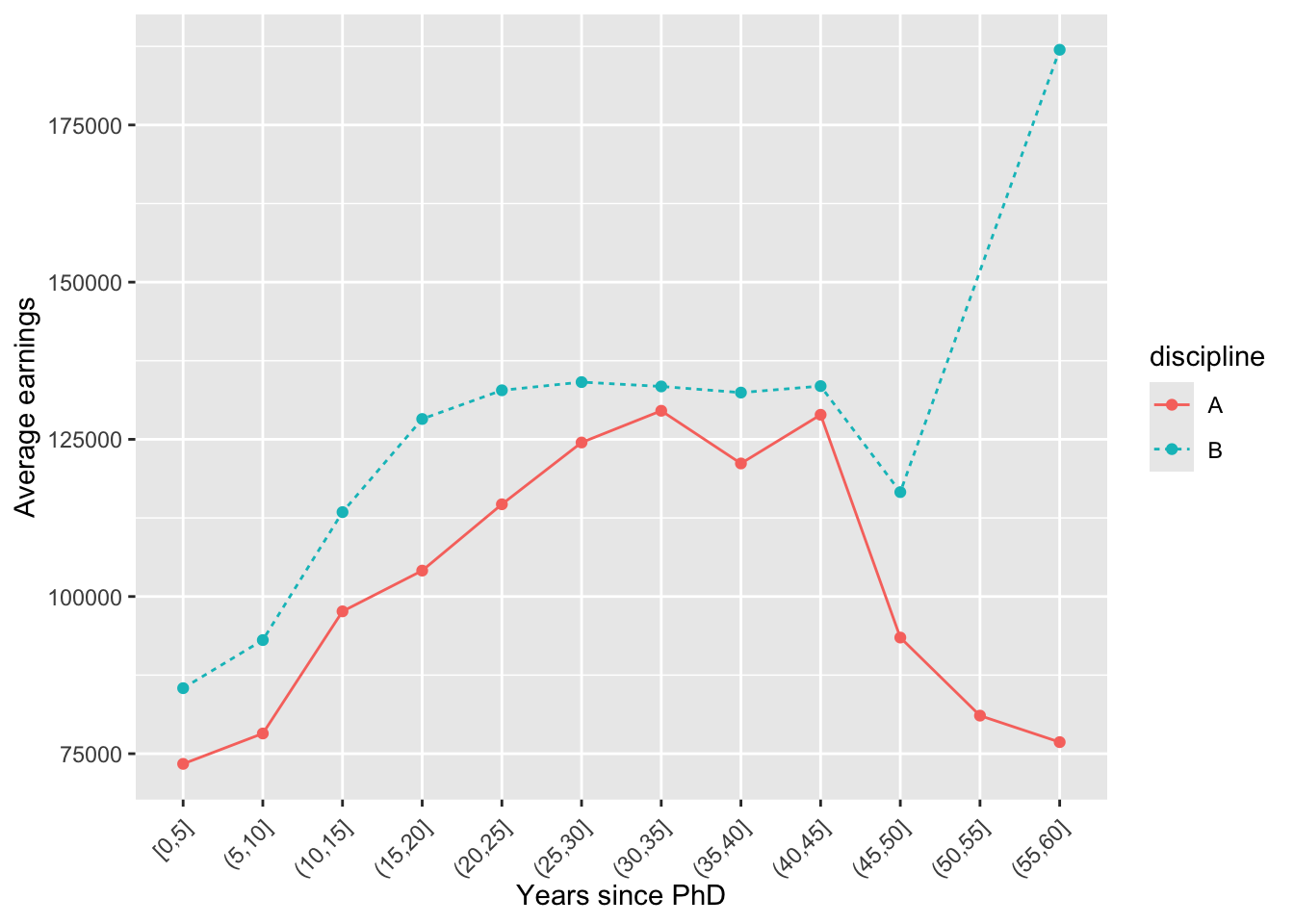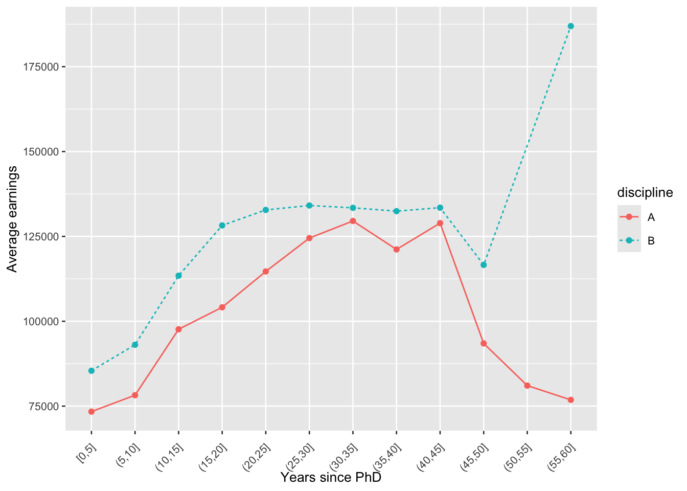 labs(x = 'Years since PhD', y = 'Average earnings')plt +