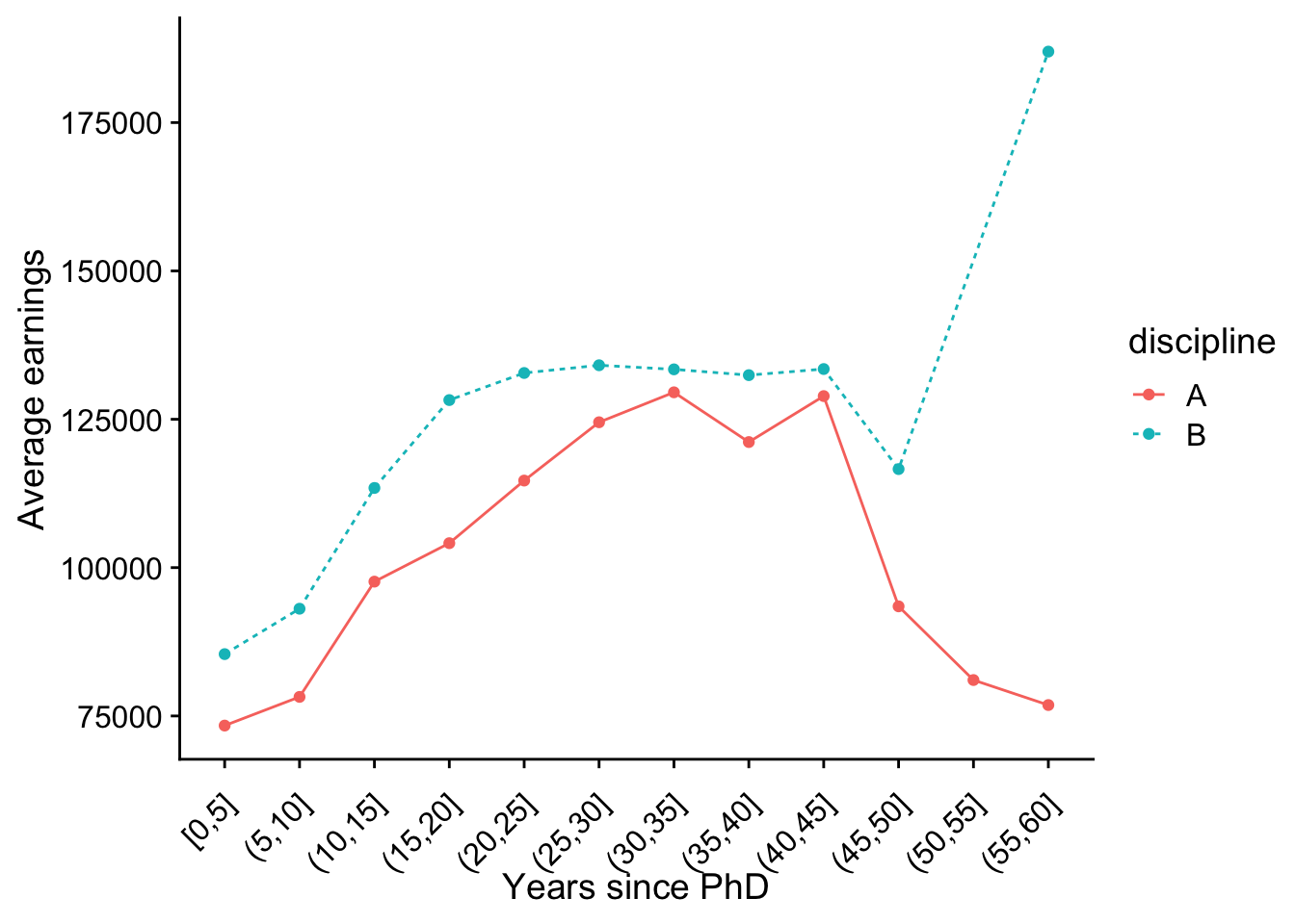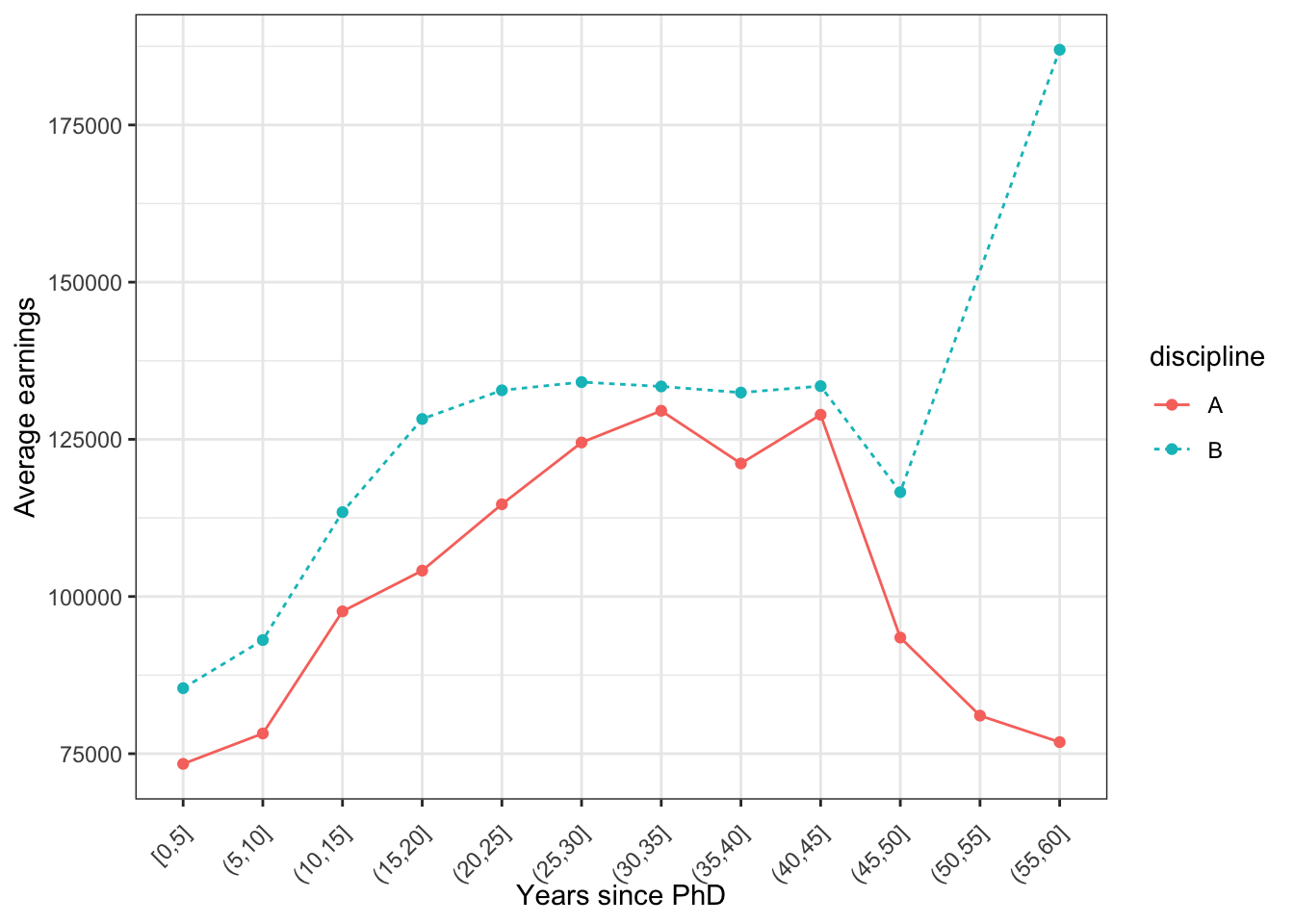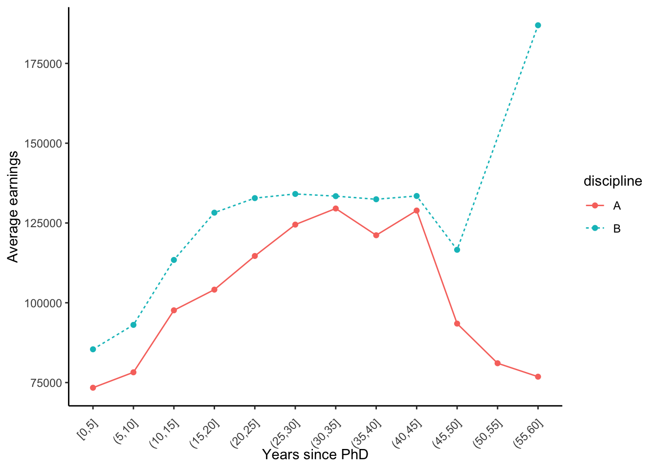 labs(x = 'Years since PhD', y = 'Average earnings')plt +