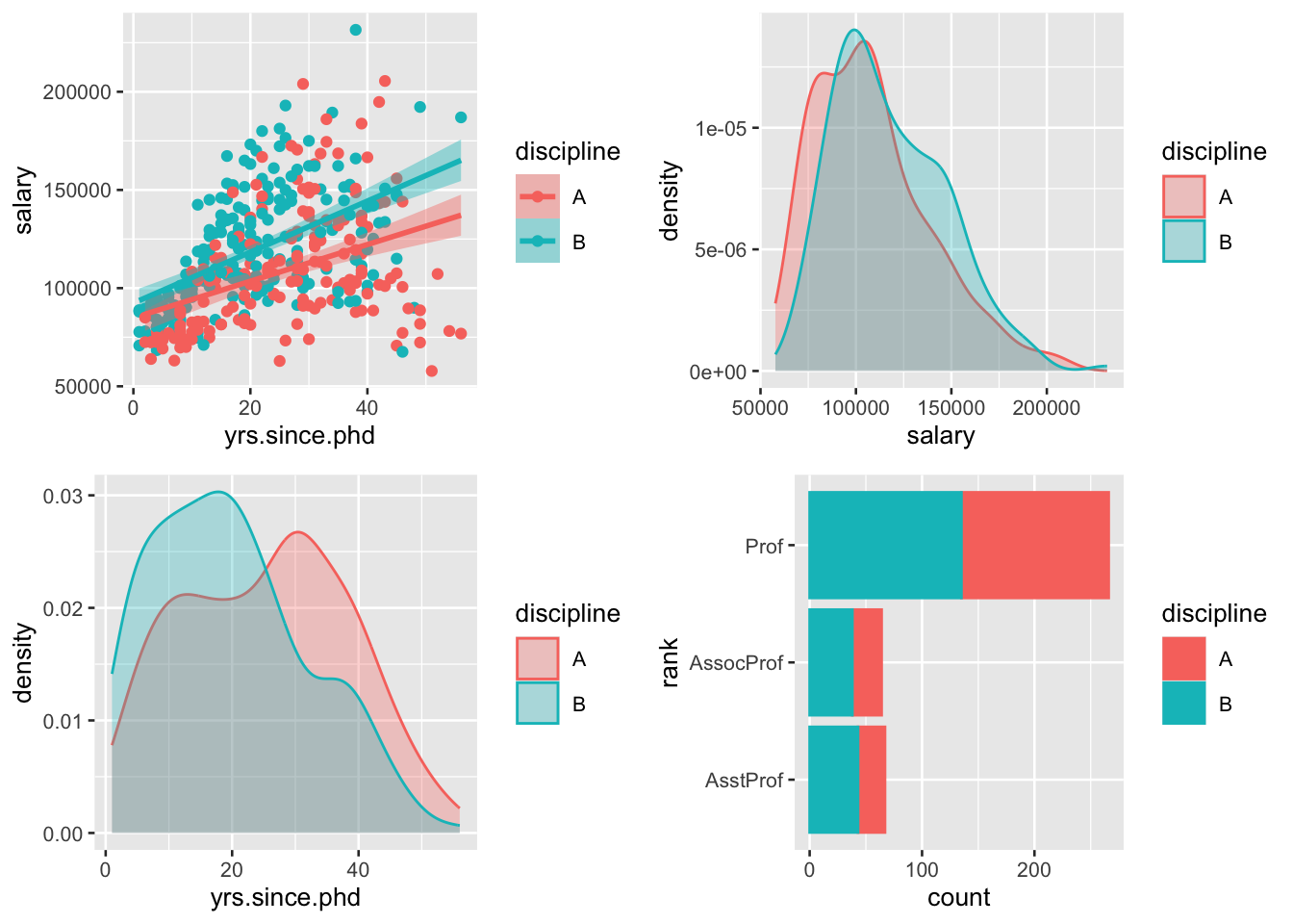 plt <- ggplot(Salaries, aes(fill = discipline, color = discipline))