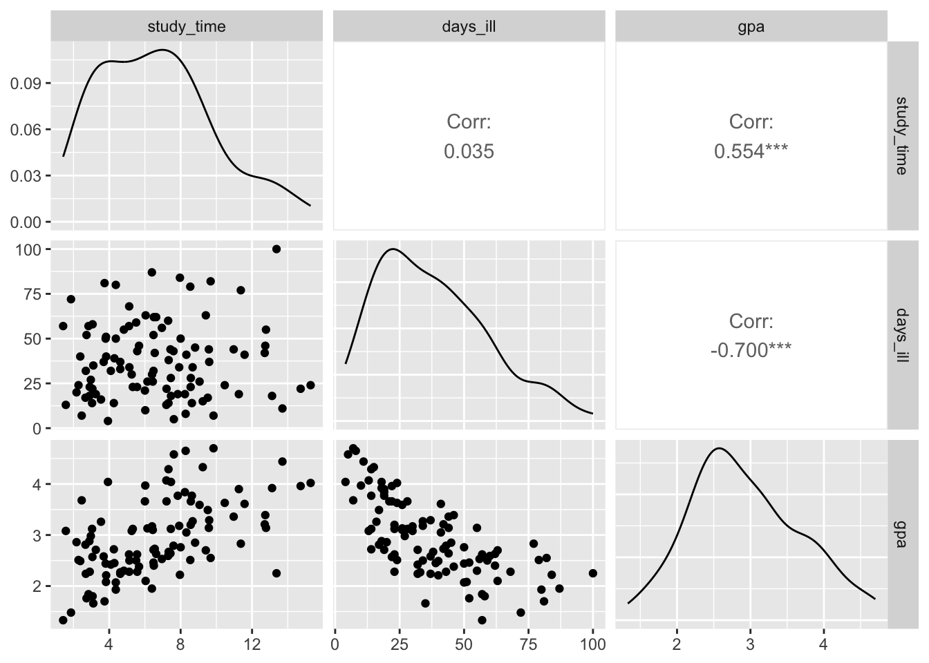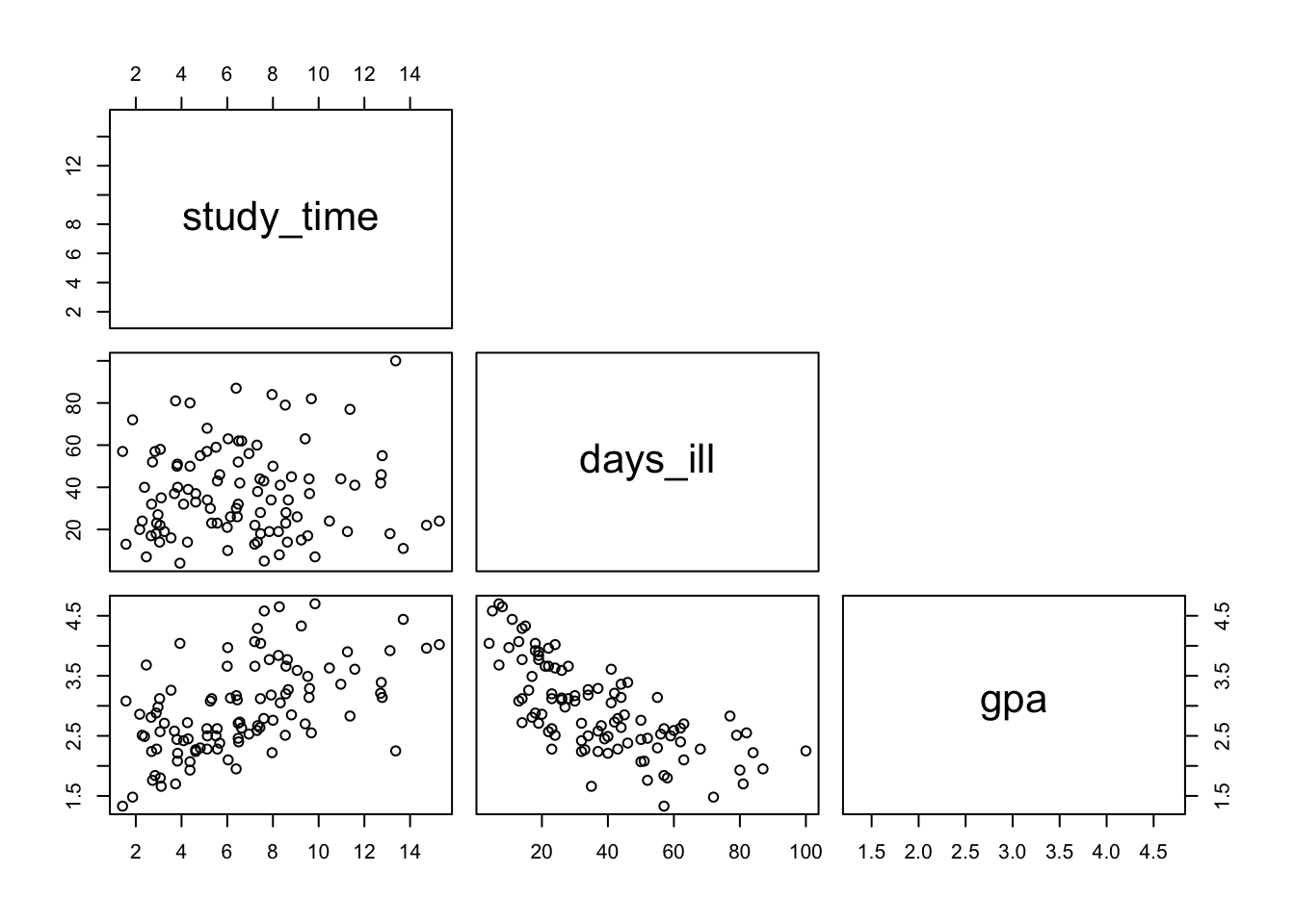 Let’s start by interpreting this plot. The rectangles with variable tell as the name of the axis. For example, the plot in the lower left corner shows the relationship between the GPA (x axis) and study time (y axis). We can see that students in our sample who spent more time studying seem to have had higher grades - points higher on one axis tend to also be higher on the other. On the other hand, students who were ill more had, on average, achieved lower grades. There seems to be no relationship between being ill and time spent studying.