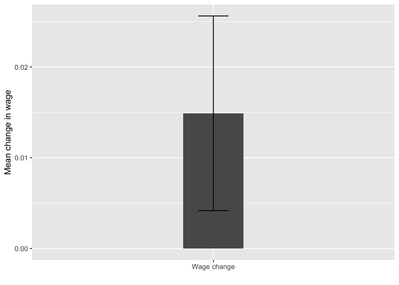 change_err = sd(change)/sqrt(n()))We than create a bar plot and add the geom_errorbar on top of it. Note that in this case we specify the x aesthetic as a chraracter 'Wage change'. This is because it is unusual to plot just one bar in the plot, and geom_col and geom_errorbar require some x aesthetic to be passed.