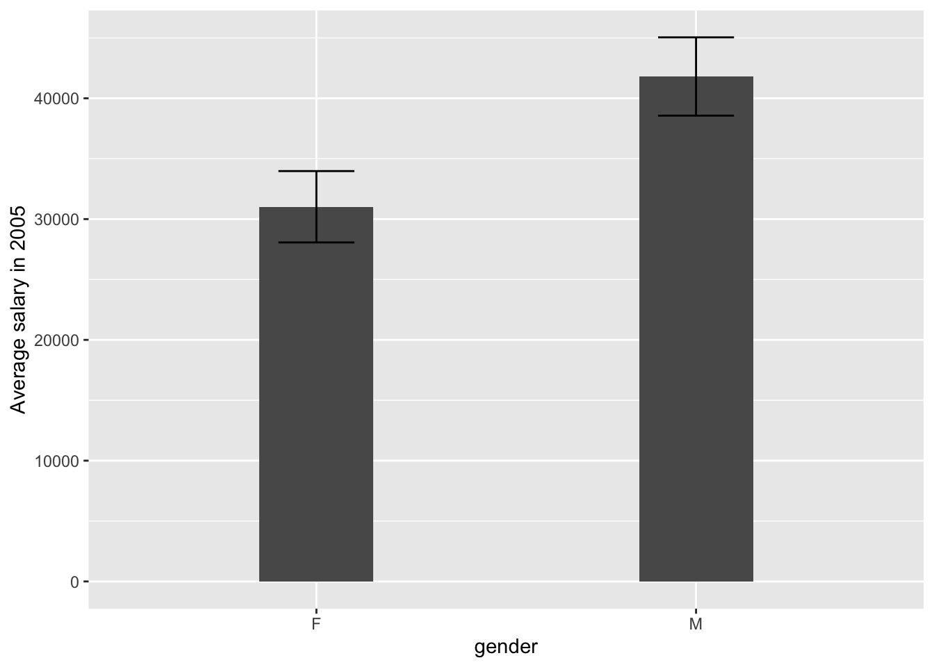 The result seem to be significant, meaning that we have statistical evidence that there is a real difference between male and female earnings in the underlying populations (or more precisely, that if we took 100 samples from the underlying population, more than 95 of them would show a non-zero difference). Based on our sample, however, the magnitude of that difference is quite difficult to determine, as we expect it to range between 19000 and 2000 dollars. We can visualize this again using geom_errorbar: