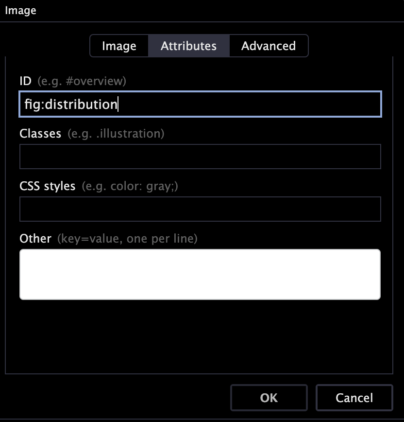The visual editing bar will also allow you to include external pictures (external in the sense that you are not creating them in R whilst creating the document). For this purpose, click on the image icon in the visual editing bar, and a new window will pop up. Under the tab “Image” you can select the image from a file in your computer. Be sure to add a caption in this tab, as well. This will be printed underneath the image in your pdf. Then click the tab “Attributes”, and in the box “ID” enter a unique identifier for the image you are inserting. I usually use “fig” for figure, a colon, and then the name of the figure: